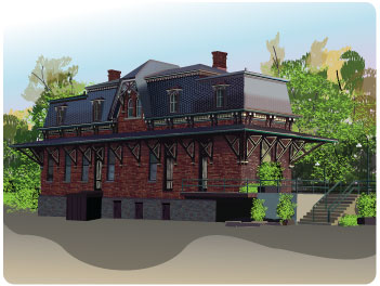 Create an Illustration of an architectural structure which includes interesting elements such as curves, colors, reflections and shadows.
